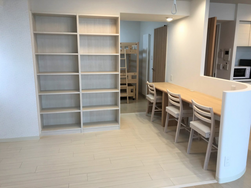 リビングに入った時には散らかりは腰壁で目に飛び込まず、かつ視線が届くように。